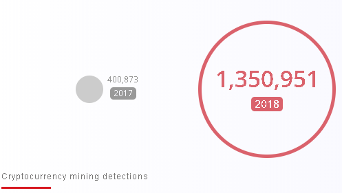 Cryptocurrency mining on the other hand has seen a new peak in 2018, with over 1.3 million detections, which is a 237 percent growth from the previous year.  There have been ample of ways that cryptocurrency-mining attacks have been perpetuated throughout the year, some examples are via penetration of ad platforms, popup ads, malicious browser extensions and many more.