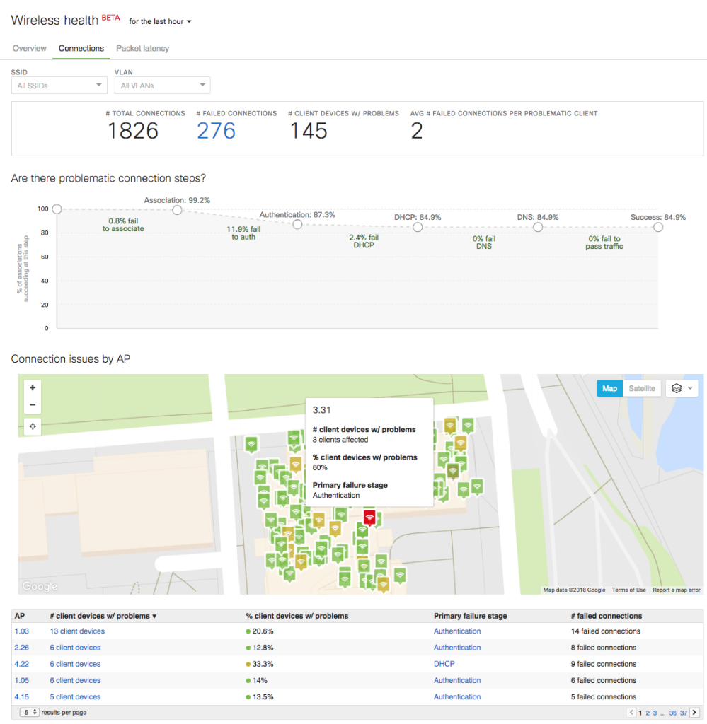 This helps IT administrators to quickly find out whether there are users who are able or unable to successfully access the wireless network and easily identify the problematic access points, clients, and failing connection stages that are the source of bad end user experience. Being able to see all access points (AP) in a given network is a critical factor in having a successful end user experience by identifying and repairing problems to avoid lengthy and inopportune downtime and latency.