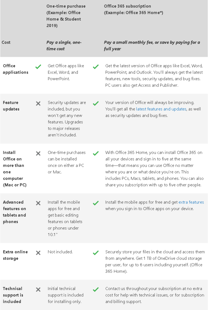 However, one thing that is not considered is that Office 365 is always updated with the latest version unlike Office 2019 which you would need to update from time to time or even purchase the latest version. For a better understanding of the main difference, you can refer to the table below for what features are included for both suites:
