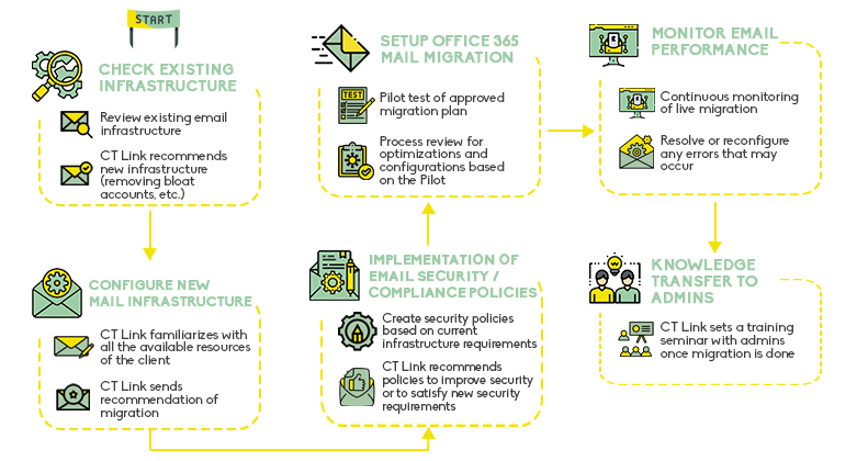 Email has always been an integral part of business since its inception. Its use has consistently grown over the past 5 years according to a recent study. According to the study, a business user in 2020 sends 127 email per day. This is why companies need a flexible email server and application, which products like Office 365 provide. However, migrating your older system can be a daunting task due to complexity and business costs that comes with it. This is where we at CT Link can help you alleviate that stress. We do this through our Office 365 migration service framework below: