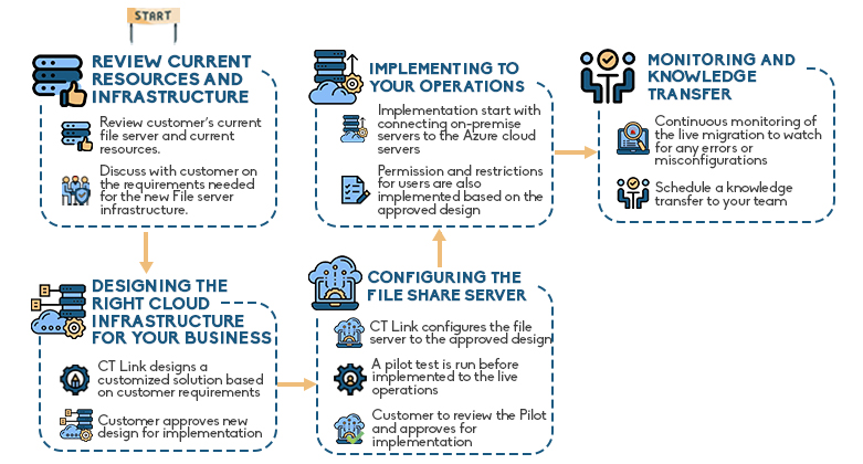 We at CT Link understand that each company is different when it comes to planning. Considerations to your requirements are made during our planning to ensure a solution tailor made for your business. We work towards making sure that our service is as easy and stress free as possible. This is to give your team the peace of mind that they need to perform other business critical task. We follow the following implementation steps for our on-premise file server and Azure File Sync services below: