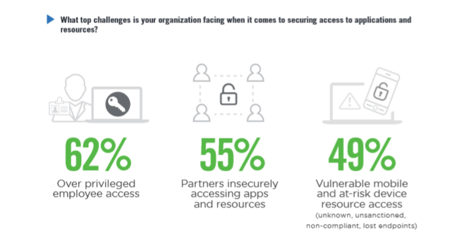 • Over 40% of participating organizations expressed privilege management, insecure partner access, cyberattacks, shadow IT risks, and vulnerable mobile and at-risk device resource access as top challenges to secure access to applications and resources